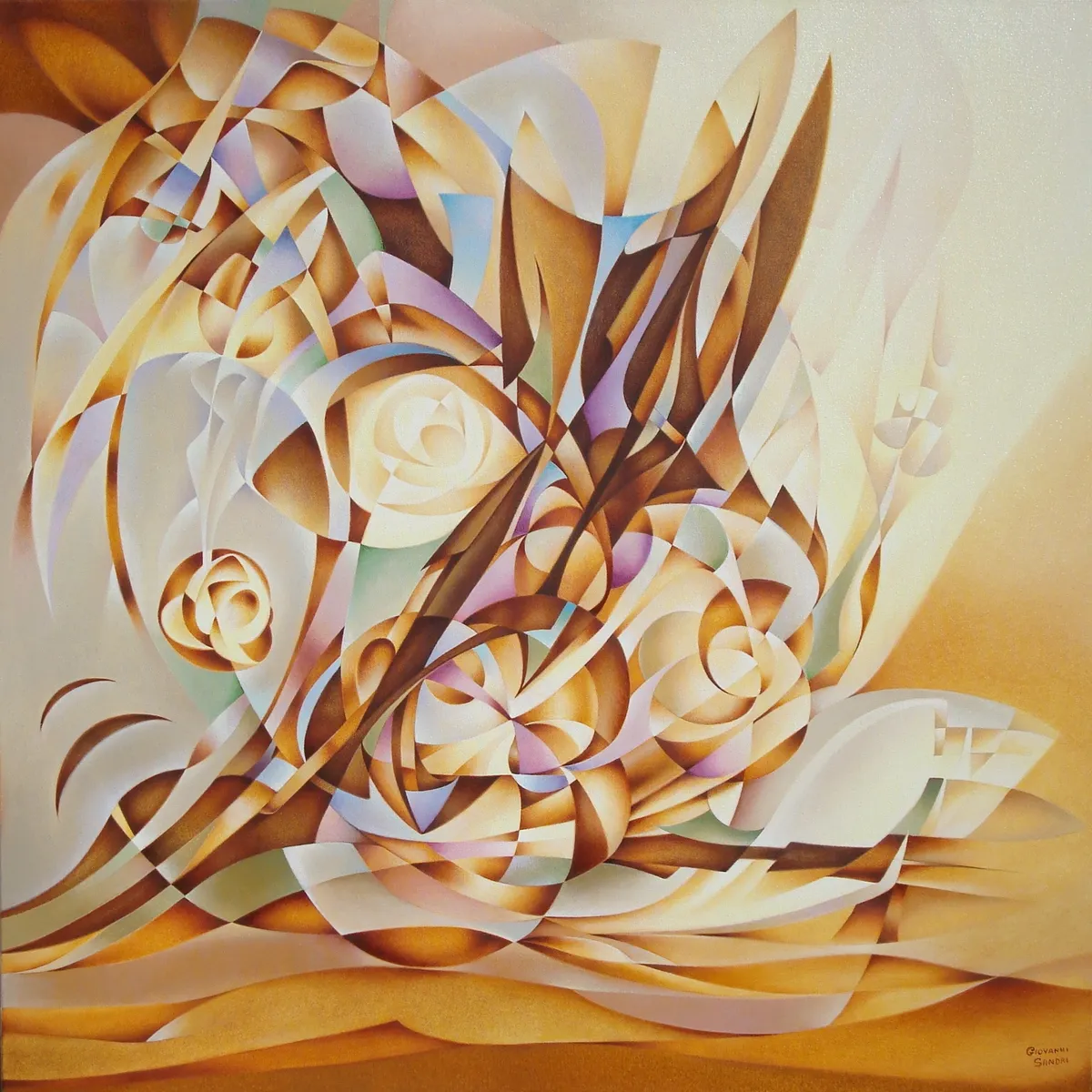 Questo dipinto astratto di Giovanni Sandri è un’opera d’arte che cattura l’essenza dell'autocoscienza. Le forme si intrecciano e si ripiegano su se stesse in un balletto visuale che invita l’osservatore a una riflessione profonda sulla presenza e la coscienza. Ogni forma, ogni linea, ogni ombra è un passo verso la realizzazione della nostra esistenza tangibile e intangibile. È un’opera d’arte che non solo delizia gli occhi ma risveglia anche l’anima, portandoci a una maggiore consapevolezza del vivere.
