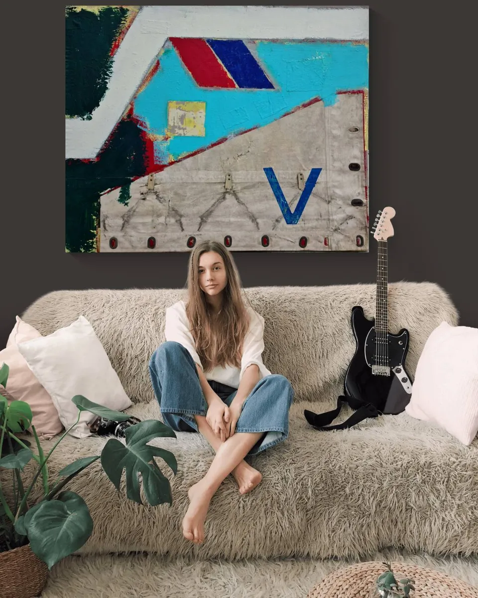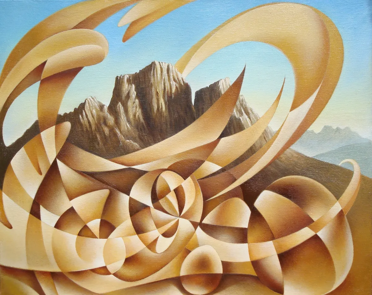 Quest’opera è una raffigurazione astratta e creativa delle Tre Cime di Lavaredo, le famose montagne delle Dolomiti. L’artista ha usato forme curve e ondeggianti che si intrecciano, dominate da tonalità di colore giallo, arancione e marrone chiaro. Queste forme richiamano le rocce, la terra, il sole e il calore, creando un contrasto con le montagne sullo sfondo, che sono rappresentate in modo più realistico, con dettagli e colori naturali. Il cielo è azzurro pallido, fornendo un contrasto delicato con le forme astratte in primo piano. L’immagine trasmette una sensazione di movimento e fluidità attraverso l’uso di linee curve e forme ondulate. L’artista ha voluto esprimere la sua visione personale e originale delle Tre Cime di Lavaredo, trasformando il paesaggio in un’opera d’arte astratta e suggestiva.
