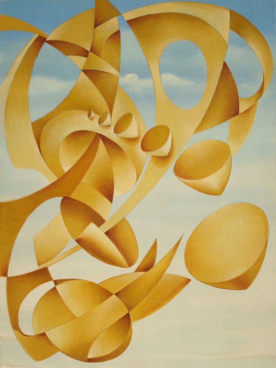 Un cielo turchino intenso, come un oceano infinito, si estende davanti ai nostri occhi. Al suo interno, fluttuano forme coniche, come le onde del mare. Immagino che le forme coniche possano essere interpretate come un simbolo di anime in viaggio. Anime che cercano di trovare il loro posto nel mondo. Anime che vogliono far parte di qualcosa di più grande di loro stesse. Il cielo turchino rappresenta la vastità delle possibilità, la libertà di scelta, la speranza di un futuro migliore.
