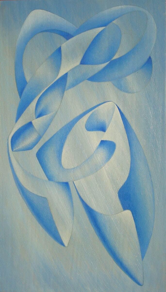 Quest’opera è una composizione astratta che gioca con le forme fluide e i colori sereni, creando un’atmosfera di calma e introspezione. Le linee sinuose si intrecciano, suggerendo movimento e connessione, mentre il gradiente sullo sfondo aggiunge profondità alla scena. Le pennellate sono visibili e conferiscono consistenza alla superficie pittorica. L’artista ha saputo creare un equilibrio armonioso tra le diverse tonalità di blu, che dominano la tavolozza cromatica e trasmettono una sensazione di pace e freschezza. Si tratta di un’opera che invita lo spettatore a perdersi nella contemplazione delle forme e dei colori, senza cercare una rappresentazione figurativa o un significato preciso. È un’opera che esprime la libertà e la creatività dell’artista, che ha scelto di usare il linguaggio astratto per comunicare le sue emozioni e le sue sensazioni.